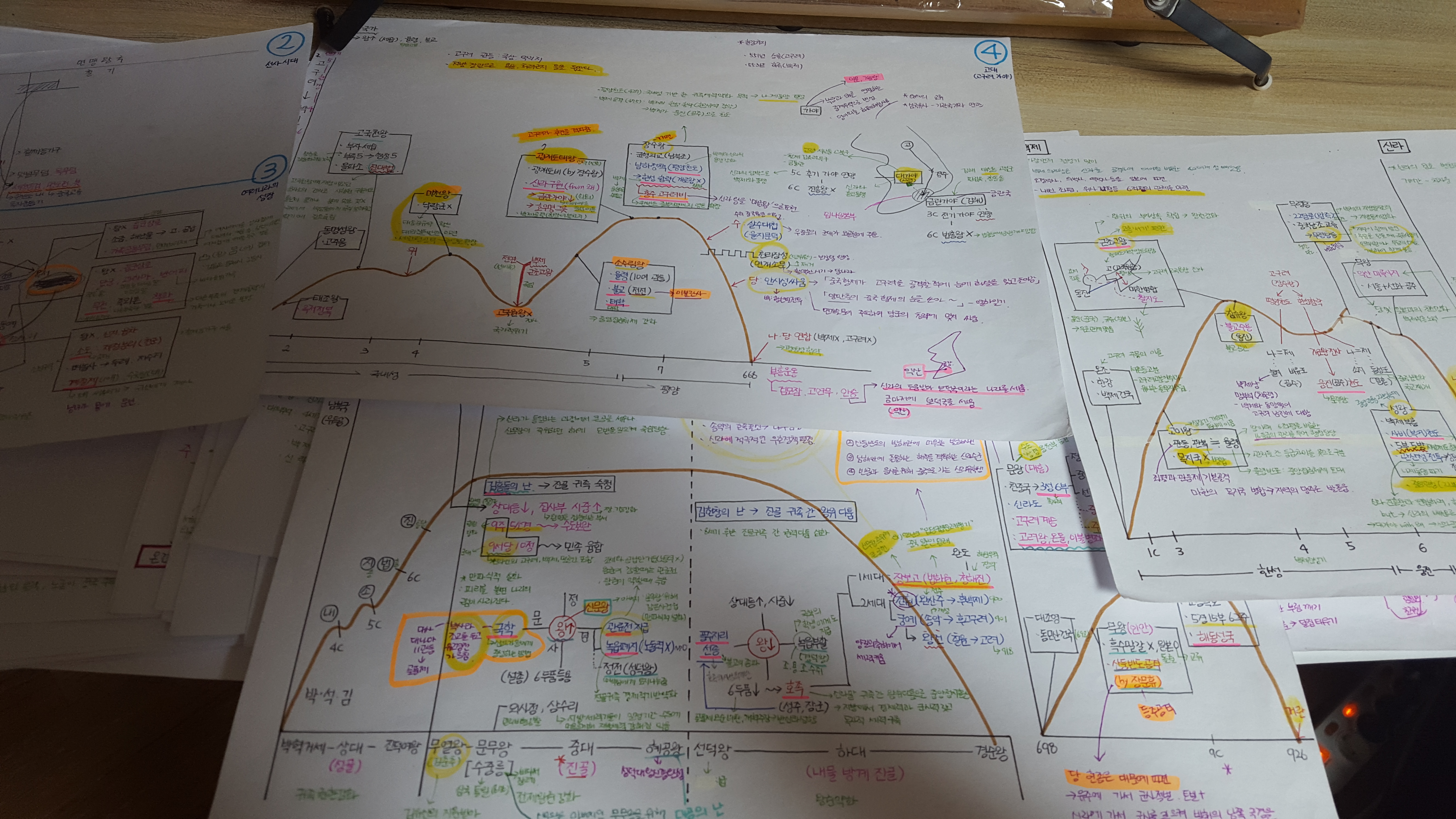 필기할 때 색깔을 지정해서 구분해놓는 것이 좋다. 가령, 최태성 선생님께서 판서할 때 쓰는 분필 색과 비슷한 볼펜으로 똑같이 필기를 했고, 기출문제 풀다가 새롭게 알게 된 부분은 초록색으로, 문제집을 보다가 새롭게 추가된 부분은 보라색으로, 1번 틀린 개념은 노란색 색연필로, 2번이상 틀린 개념은 주황생 형광펜으로 구분해놨다. 이렇게 해두면, 막판에 모르는 부분만 훝고 시험볼 수 있어서 정말 유용하다. 시험 직전에만 잘 봐두면 몇개는 그냥 정답이 나오기도 한다.